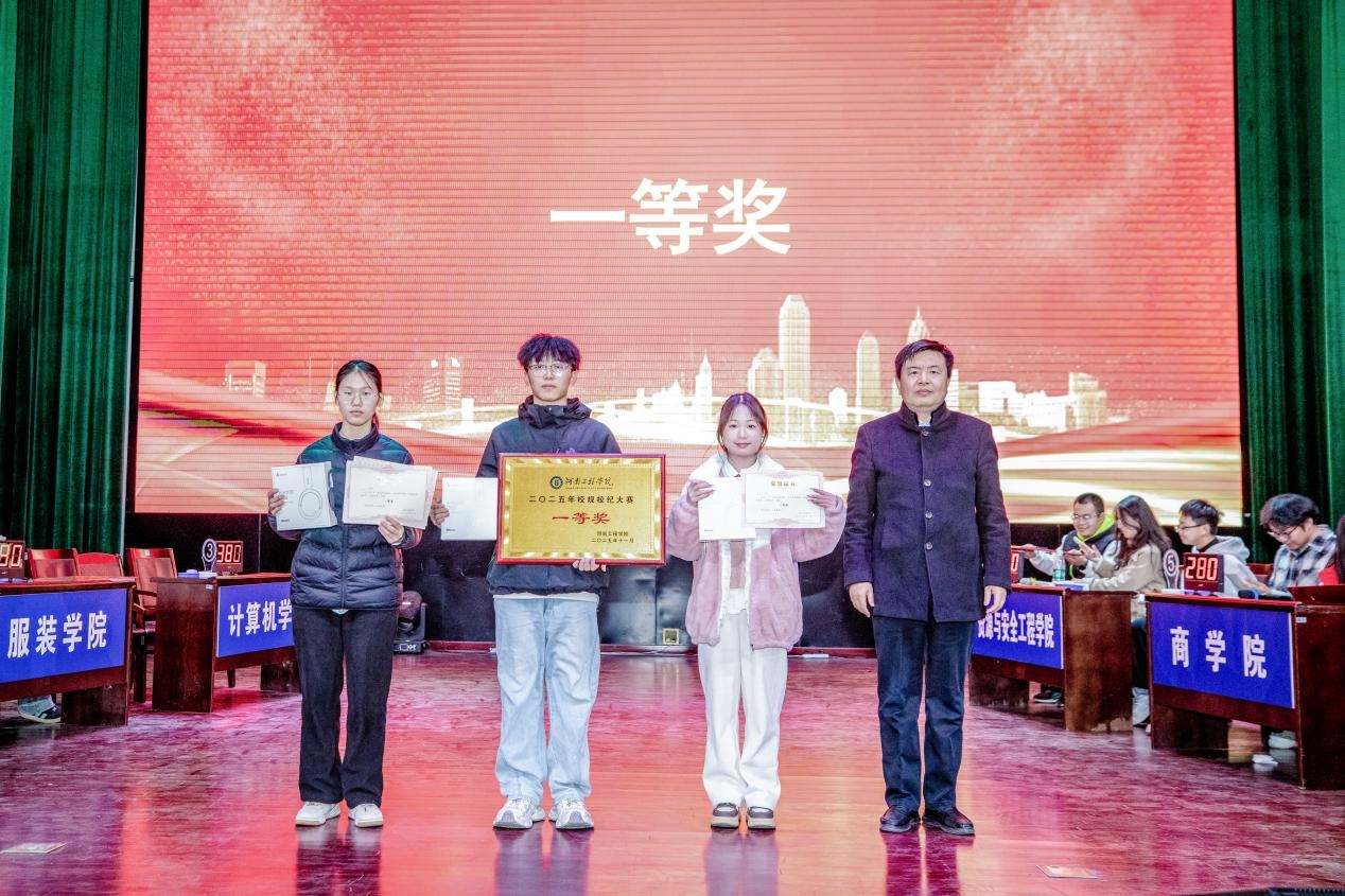 决赛设置“基础必答·规纪摸底考”“限时快答·速度挑战赛”“极限抢答·活力闪电赛”“竞技挑战·荣耀争夺赛”四个环节。比赛过程中,选手们思维敏捷,答题准确流畅,尽显应变能力和扎实功底;现场气氛紧张而热烈,掌声与喝彩声此起彼伏。经过激烈角逐,计算机学院荣获一等奖,材料工程学院、资源与安全工程学院荣获二等奖,服装学院、商学院、人文政法学院荣获三等奖。软件学院、土木工程学院、外语学院、计算机学院、材料工程学院荣获“优秀组织奖”。与会领导为获奖学院颁奖,合影留念。